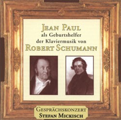 "Der durch seine Einführungsvorträge zu den Bayreuther Festpielaufführungen als faszinierender Referent bekannte Pianist Stefan Mickisch befasst sich mit dem Einfluss des Dichters Jean Paul Friedrich Richter (1763-1825) auf die Klavierkompositionen des jungen Robert Schumann. Indem dieser Bilder und Wendungen aus dem Roman "Flegeljahre" buchstäblich in Musik umsetzte, wurde Jean Paul zum Geburtshelfer der Papillons und damit eines unerhört neuen Klavierstils. Die jeweils auf den Text bezogenen, also gültigen Metronomangaben Schumanns wurden schon von Clara Schumann und fast allen anderen Pianisten missachtet. Diese Erkenntnisse werfen auch auf andere, durch Jean Paul inspirierte Klavierkompositionen Schumanns ein neues Licht, wie Mickisch in seinen unverfälschten, 'authentischen' Interpretationen auf beeindruckende Weise offenbart." Manfred Eger